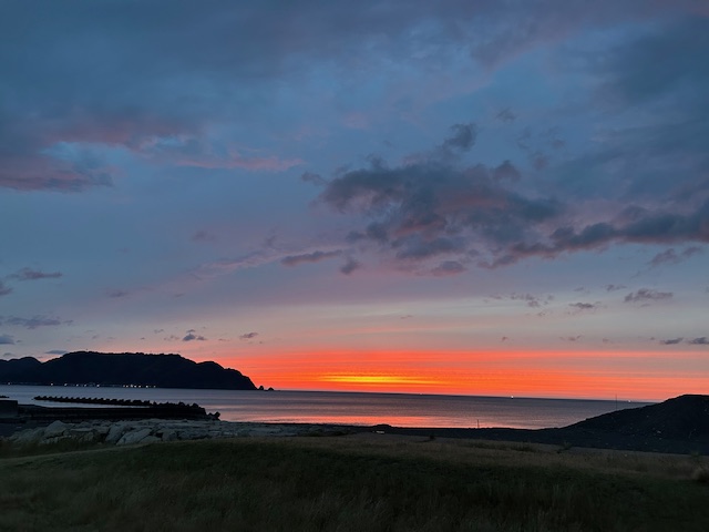 見てください、この色彩! 空を覆う深いブルーと、水平線付近で燃えるような鮮やかなオレンジ。 海面に一筋の道のように反射する光が、本当に幻想的で、ただただ無言で見入ってしまいました。
