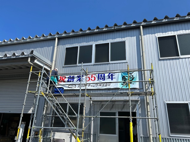 新緑がまぶしい空の下、わが社の社屋に、特別な「55周年記念横断幕」がついに設置されました!
